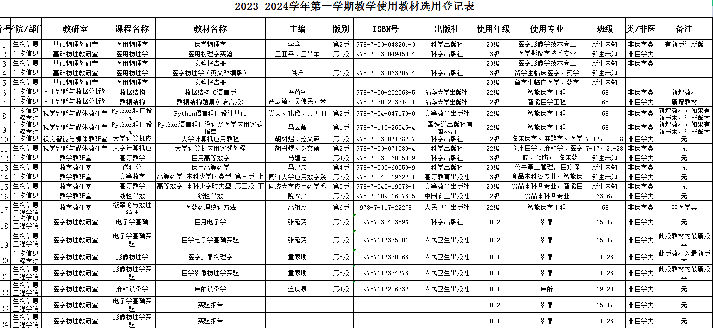 依据锦医大校字〔2022〕156号《DB旗舰官方网站入口教材管理办法(修订)》文件要求,现对生物信息工程公司2023-2024学年第一学期教学使用教材选用情况进行公示,公示期为7月8日至7月10日三天,如有异议,请在公示期内与公司科教科联系。