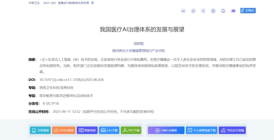 近日,公司副经理、智能医学工程专业负责人胡树煜教授撰写的《我国医疗AI治理体系的发展与展望》一文,在健康领域权威期刊《中国卫生》第六期以封面报道形式正式发表。文章系统梳理了我国医疗人工智能(AI)治理体系的发展脉络,深入探讨了当前面临的挑战与未来发展方向,为构建规范化、透明化的医疗AI治理框架提供了理论支撑与实践参考。