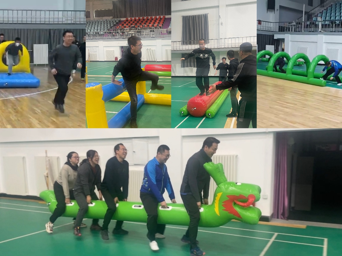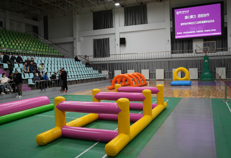 此次职工趣味运动会项目共分5个环节,分别是鲤鱼跳龙门、超级跨栏、独木桥、钻隧道和集体赛龙舟,需要5名职工协作完成。公司机关、各教研室和实验教学中心职工齐聚体育馆,踊跃组队参赛。